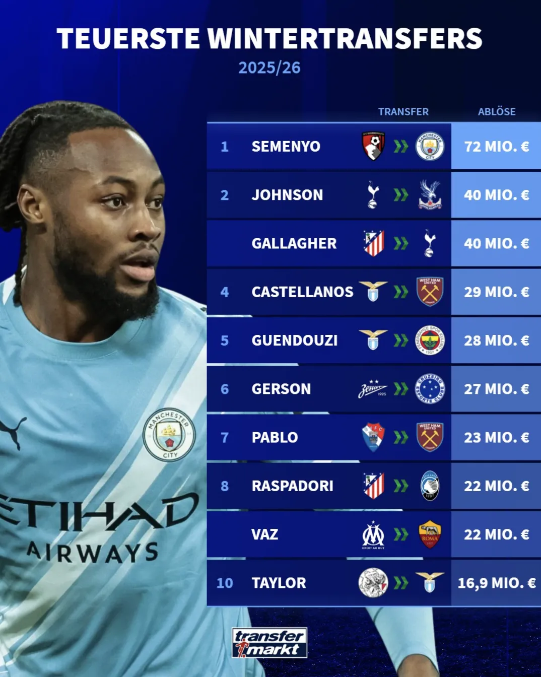 塞梅尼奥以7200万加盟曼城高居榜首,转会水晶宫的约翰逊和转会热刺的加拉格尔分别以4000万并列第二。