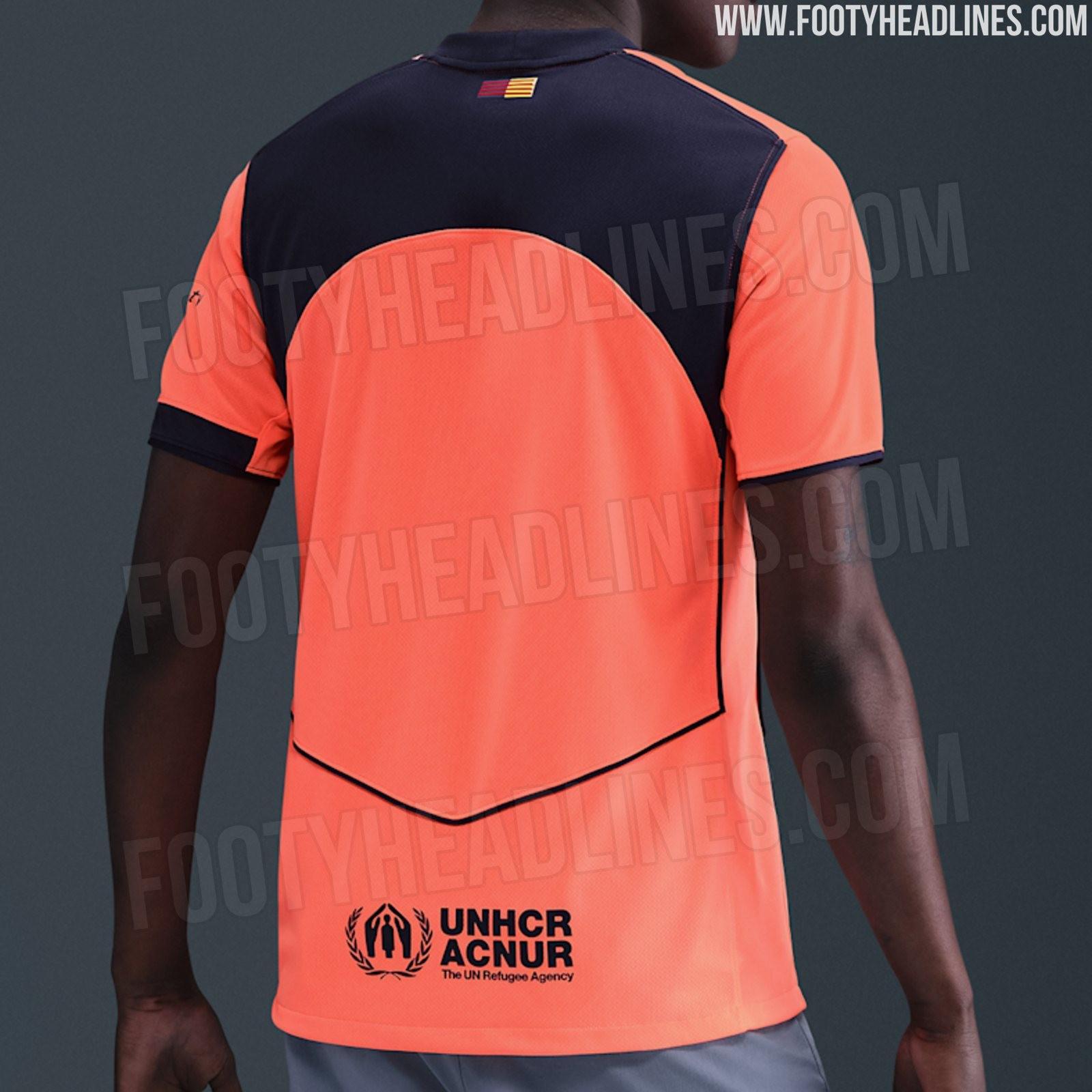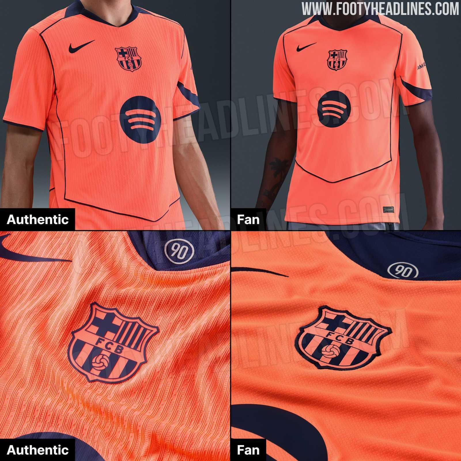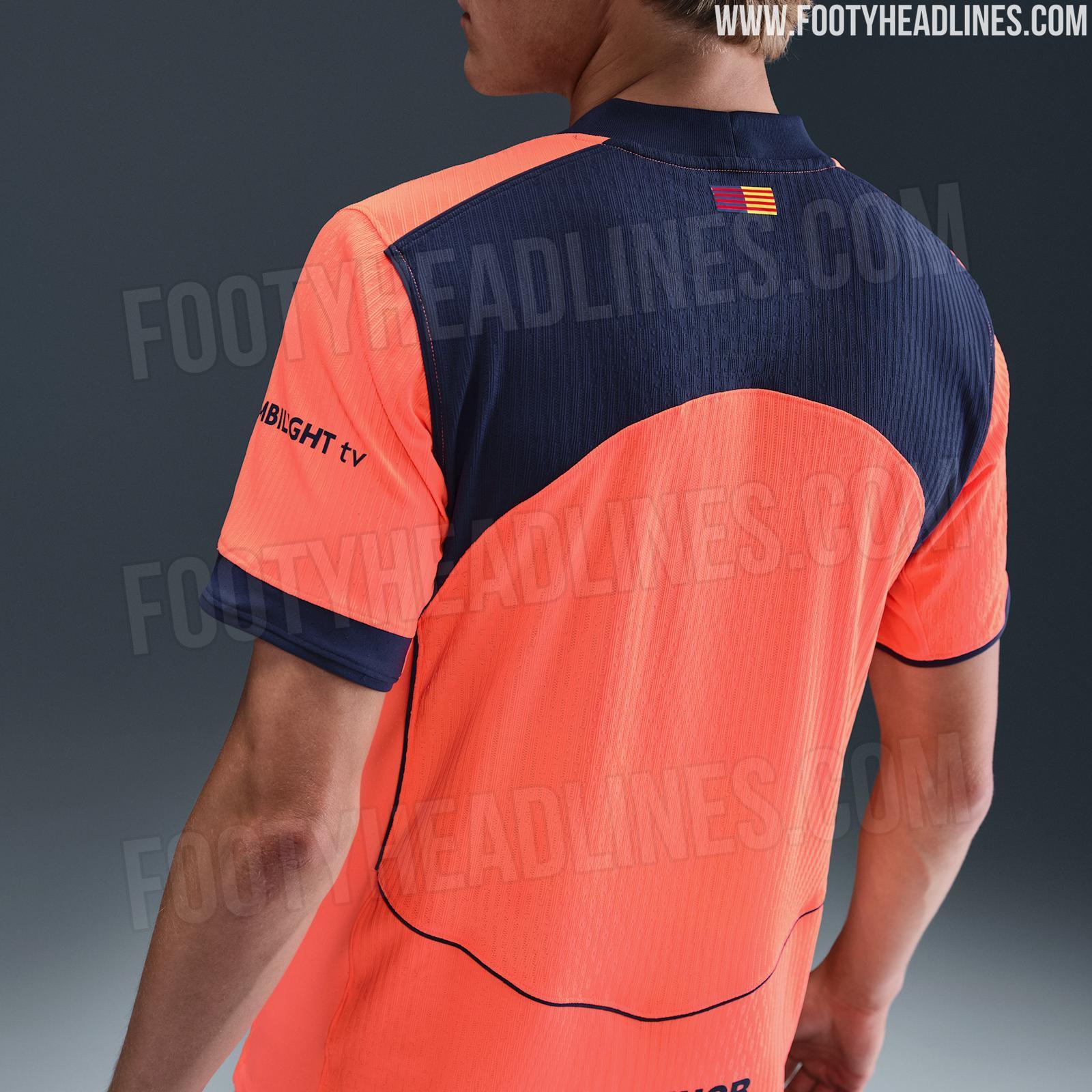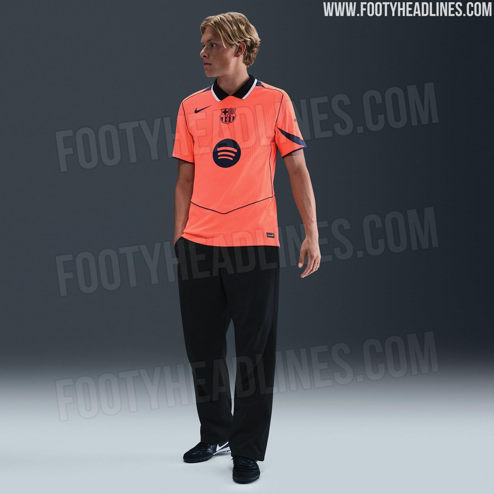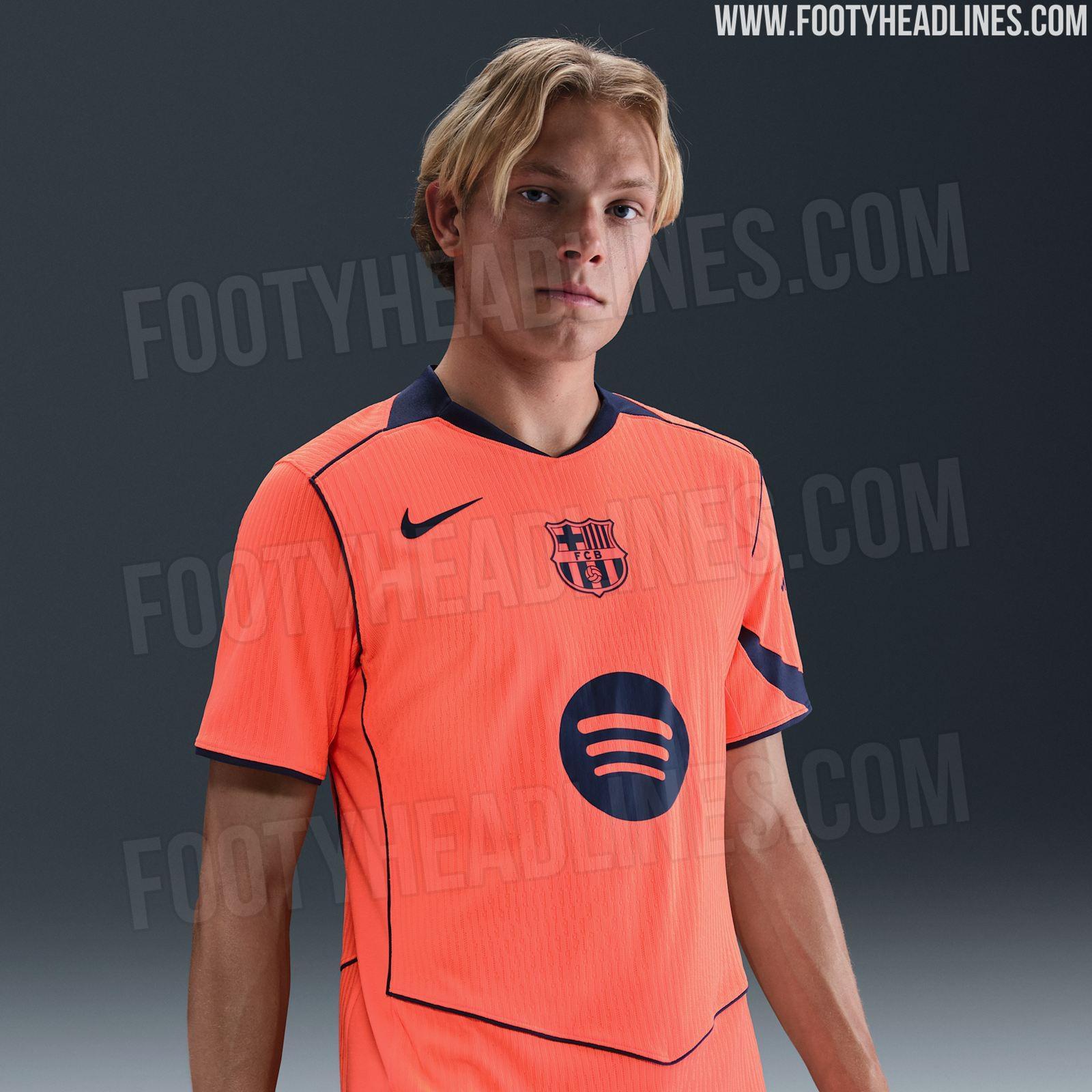 巴萨2025/26赛季第三球衣以明亮的橙色(官方命名为“亮芒果色”)为主色调,搭配深海军蓝(“午夜海军蓝”)作为配色,其颜色搭配与2009/11赛季的球队客场球衣十分相似。